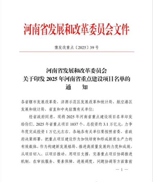1月20日,河南省發(fā)改委發(fā)布《2025年河南省重點(diǎn)建設(shè)項(xiàng)目名單》。城發(fā)·高新生物經(jīng)濟(jì)產(chǎn)業(yè)園名列其中,入選2025年河南省重點(diǎn)建設(shè)項(xiàng)目。2025年省重點(diǎn)項(xiàng)目1037個、總投資約3.1萬億元,力爭年度完成投資1萬億元左右。