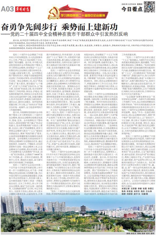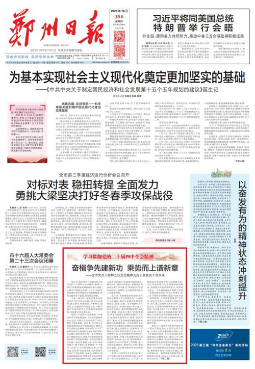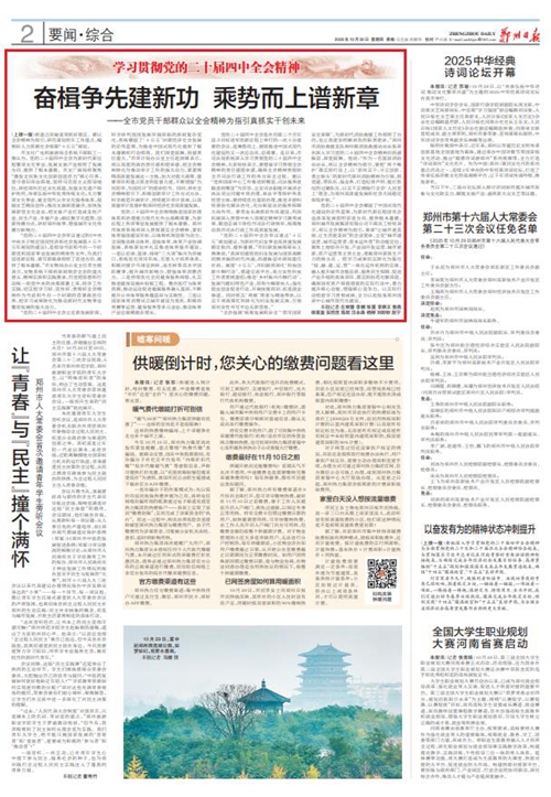 黨的二十屆四中全會(huì)擘畫了中國式現(xiàn)代化建設(shè)的宏偉藍(lán)圖,為新時(shí)代新征程國有企業(yè)改革發(fā)展指明前進(jìn)方向、提供根本遵循,鄭州城發(fā)集團(tuán)廣大黨員干部群眾深受鼓舞、倍感振奮。近日,《鄭州日?qǐng)?bào)》《鄭州晚報(bào)》開設(shè)了【學(xué)習(xí)貫徹黨的二十屆四中全會(huì)精神】專欄,2025年10月30日,報(bào)道了鄭州城發(fā)集團(tuán)深入學(xué)習(xí)貫徹落實(shí)黨的二十屆四中全會(huì)精神,以全會(huì)精神為指引真抓實(shí)干創(chuàng)未來。