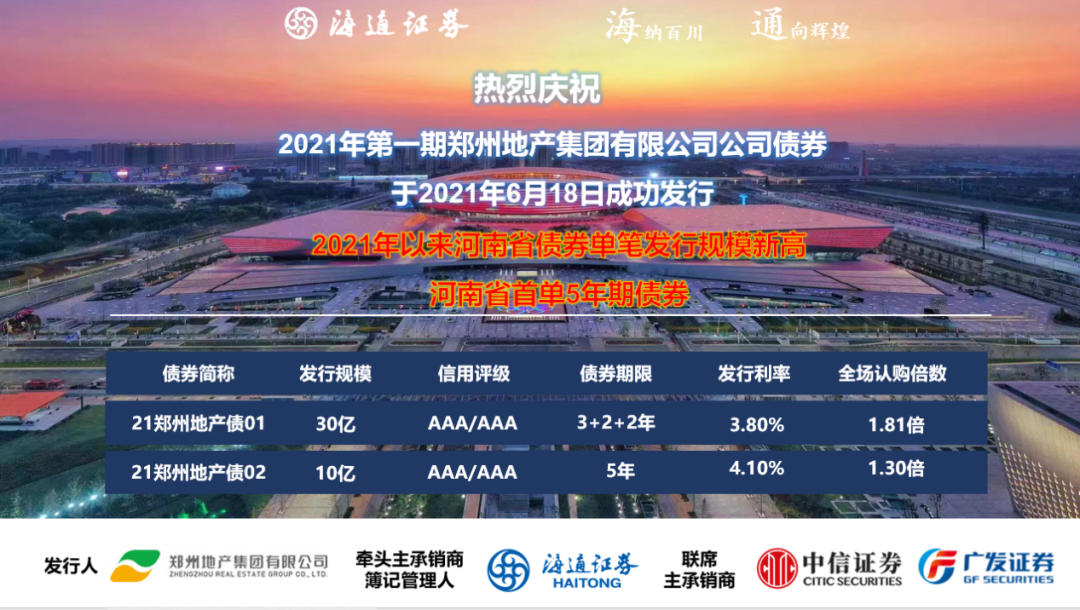 黨史學(xué)習(xí)教育在鄭州地產(chǎn)集團如火如荼開展,集團黨委在鄭州市委、市政府的領(lǐng)導(dǎo)下,在鄭州市國資委黨委的監(jiān)管下,在學(xué)黨史、悟初心的基礎(chǔ)上,將“辦實事、解難題”作為黨史學(xué)習(xí)教育的重要內(nèi)容,充分釋放黨建紅色生產(chǎn)力,推進(jìn)黨史教育深入業(yè)務(wù)實踐,引領(lǐng)業(yè)務(wù)高質(zhì)量發(fā)展。在集團黨委的堅強領(lǐng)導(dǎo)下,鄭州地產(chǎn)集團6月18日成功發(fā)行第一期優(yōu)質(zhì)企業(yè)債券40億元,3+2+2年期產(chǎn)品發(fā)行利率3.8%,5年期產(chǎn)品發(fā)行利率4.1%。本次發(fā)行創(chuàng)河南省首單5年期企業(yè)債券,創(chuàng)2021年以來河南省債券單筆發(fā)行規(guī)模新高,是鄭州地產(chǎn)集團資本市場融資工具的又一創(chuàng)新探索!
