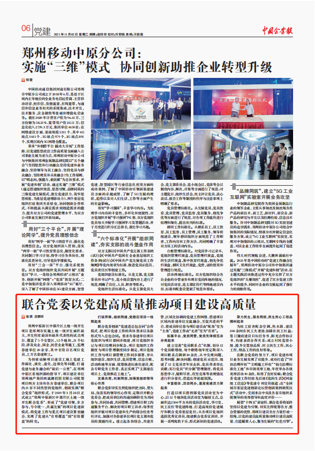 11月2日,由中國企業(yè)聯(lián)合會(huì)、中國企業(yè)家協(xié)會(huì)主管的中央級(jí)報(bào)紙《中國企業(yè)報(bào)》對(duì)西流湖公司黨建工作先進(jìn)經(jīng)驗(yàn)進(jìn)行了宣傳報(bào)道。