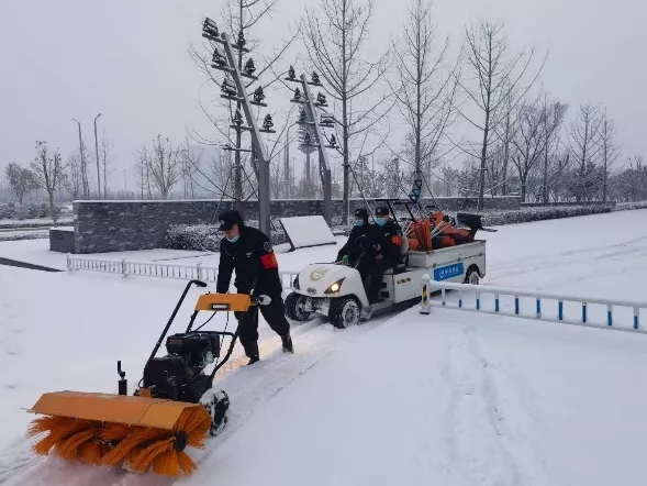 1月21日暴雪如期而至,鄭州奧體中心立刻根據雪情安排作業路段及區域,投入人員百余人、輔助工具近200個,各類除雪輔助車輛5輛,融雪劑2噸,第一時間清除機動車道、步道上的積雪,確保道路安全不結冰。對園區出入口、園區內外環主要道路、建國飯店門廳、疫苗接種中心、辦公區域周邊做好除雪、防滑措施。